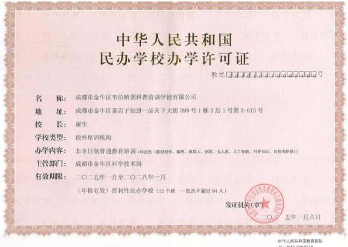 wbcoding.cn伟伯少儿编程(伟伯科创活动中心)始于2011年,隶属于“成都晴朗教育咨询有限公司”,是四川省科学技术协会-科普惠民共享基地,秉承5好(好课程、好老师、好教学、好服务、好效果),先后在成都、北京、美国洛杉矶、新加坡设立科创实训基地,是国内最早借鉴北美STEM教育理念和实践,专注3-16岁乐高/vex机器人智能编程,Scratch图形化及Python人工智能编程、C++信息学奥赛等少儿编程教育,相关课程荣获国家版权局作品登记证书,通过ISO国际质量管理体系认证,是集国内外大型科技、科创类赛事,青少儿机器人及编程认证测评,国内外游学,冬夏令营等于一体的少儿编程科技教育公司。
